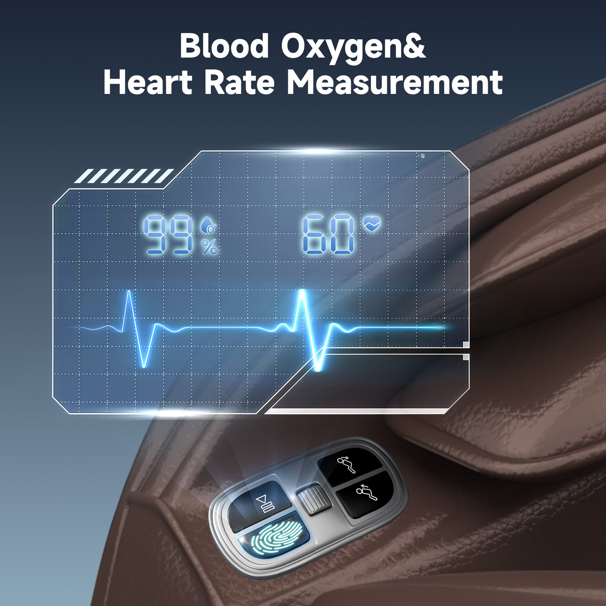 After a voice prompt, gently press the multi-function button with your middle finger for 20 seconds to measure blood oxygen levels and heart rate—stay informed about your body’s status while you relax.