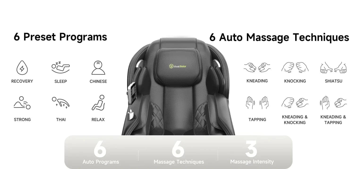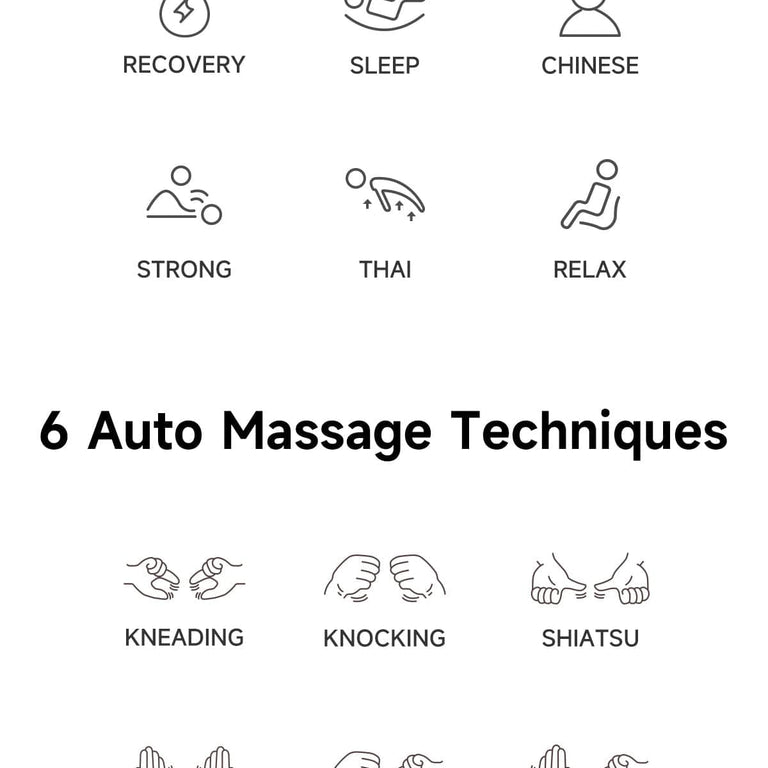 A:There are 6 auto modes: Relax, Chinese, Thai, Sleep, Recovery and Strong.